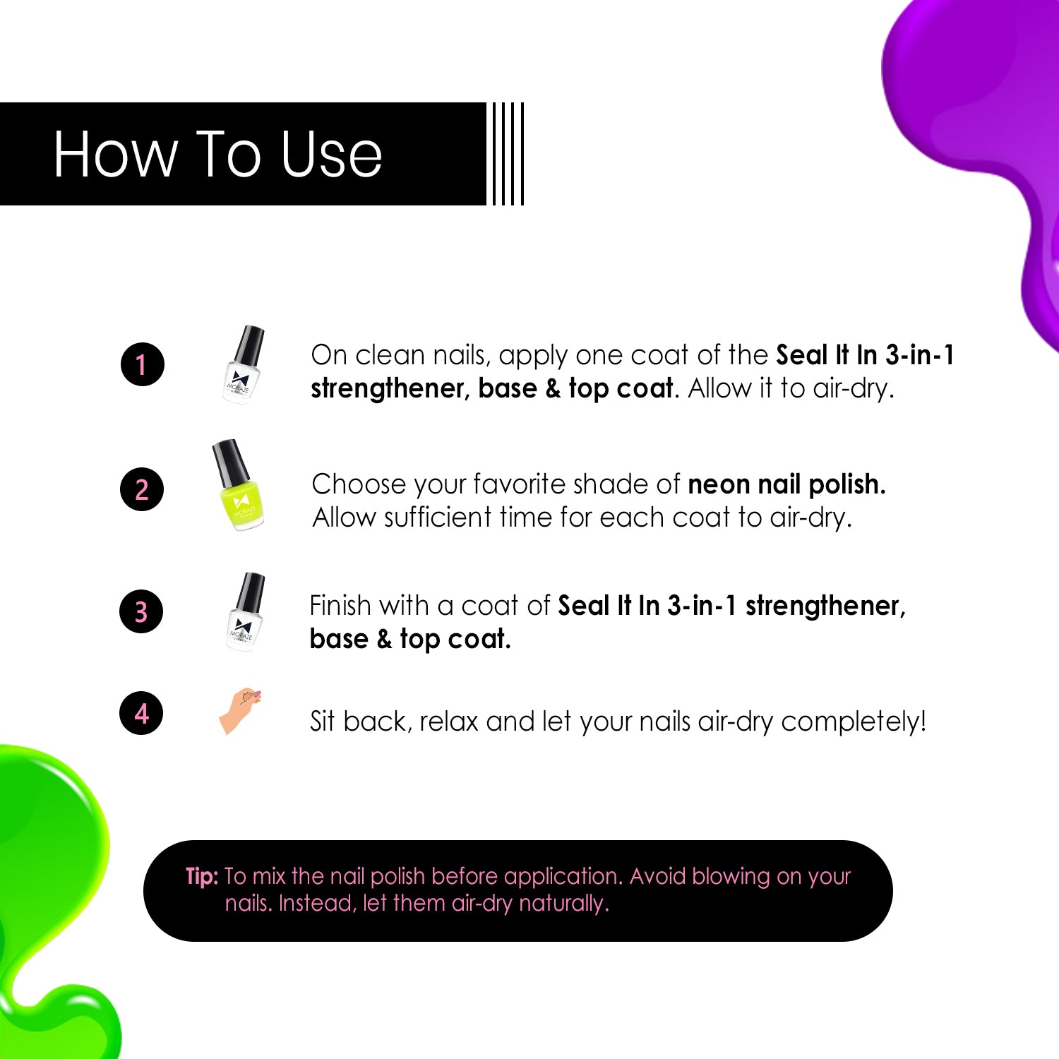 Upgrade your nail game and make a bold statement with our Neon Nail Polish collection. Get ready to turn heads and showcase your colorful personality through your manicure. Order yours today and let your nails shine bright!